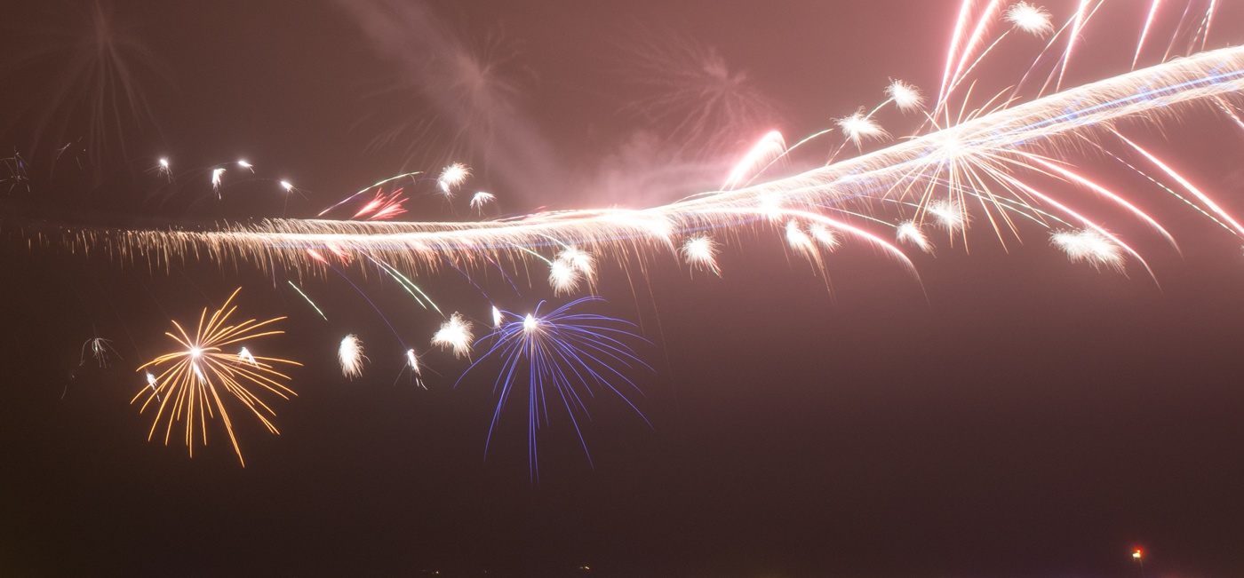 The flight display, light & pyro is synchronized to music via loud speakers on the ground. All light effects